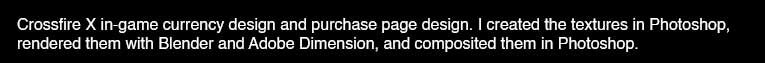 CrossFire X in-game currency design created using Photoshop for base design and textures, followed by 3D modeling with Blender and Dimension for final rendering and composite imagery.